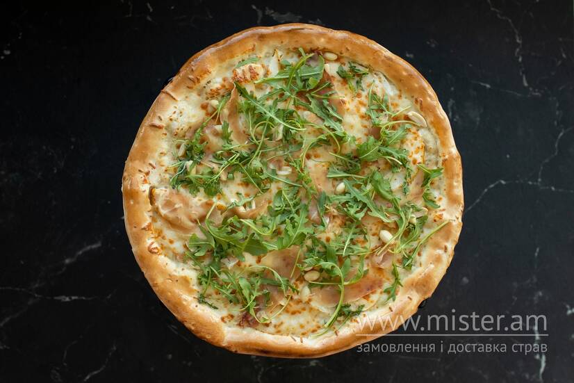 Піца на основі вершкового соусу, прошуто, сиру моцарелла, груші, арахісу та рукколи.