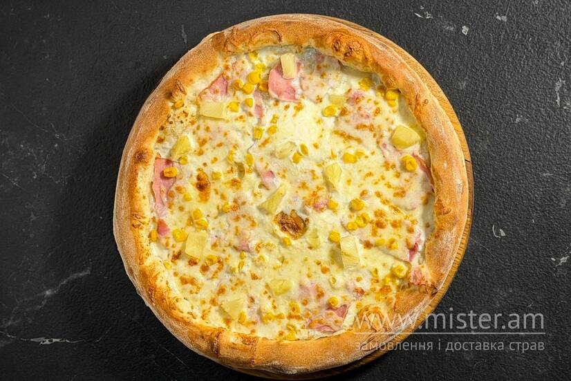 На основі вершків, з додаванням копченого курячого філе, кукурудзи, ананасу та моцарели.
