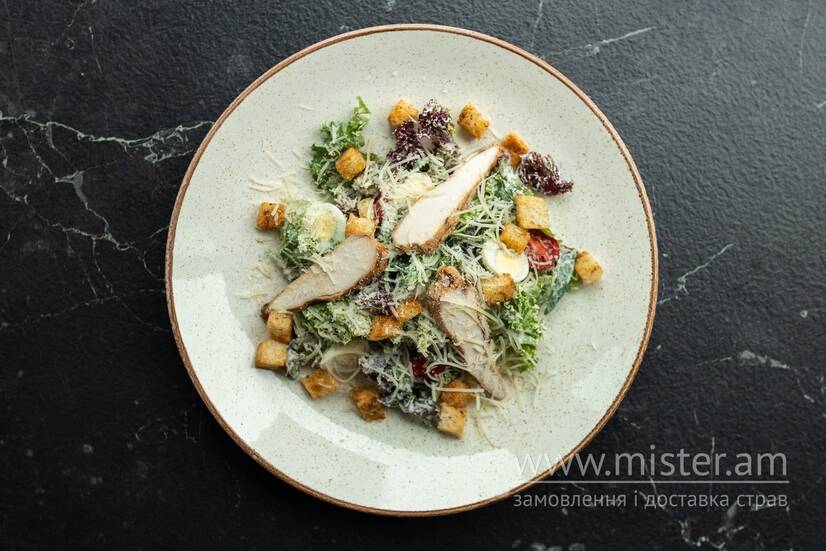 Мікс зелені, помідор черрі, соковите філе курочки, сир пармезан, яйця перепелині. Салат заправлений соусом Цезар.
