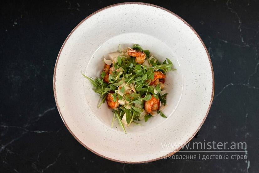 Салат з молодої руколи, свіжої груши та криветок в соусі тереякі. Заправляємо соусом з оливкової олії та соєвого соусу. Прикрашаємо мигдалевими пластівцями.