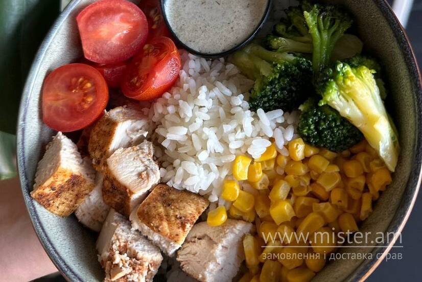 Боул з рисом, куркою, кукурудзою, броколі та томатами чері з вершковим соусом