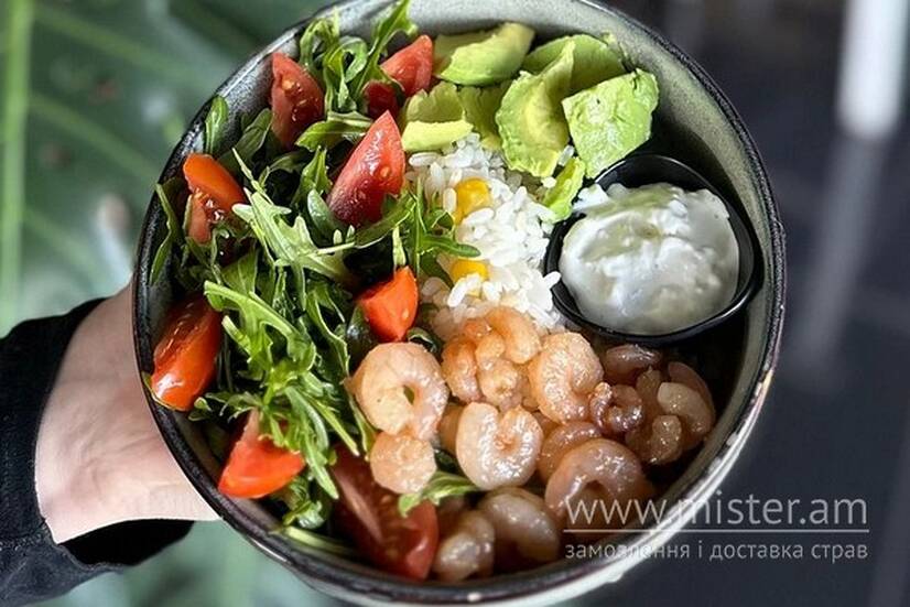 Butter Cafe Боул з рисом, креветками, авокадо, кукурудзою, руколою та томатами з сирним соусом