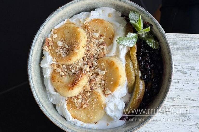 З карамелізованою грушею, горіхами та ягодами чорниці.
