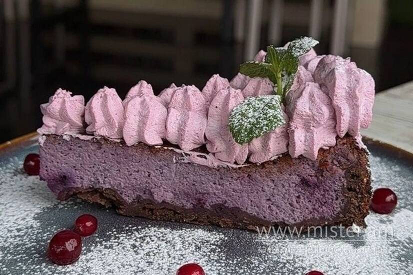 Ніжний вершковий крем та чіз кейк з ягодами чорниці на подушці з шоколадного коржа.
