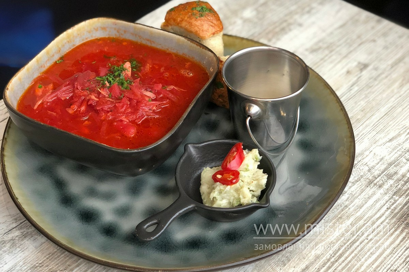 Борщ зі свининою, сало мелене з часником, пампушки власного виробництва, сметана, олія часникова.