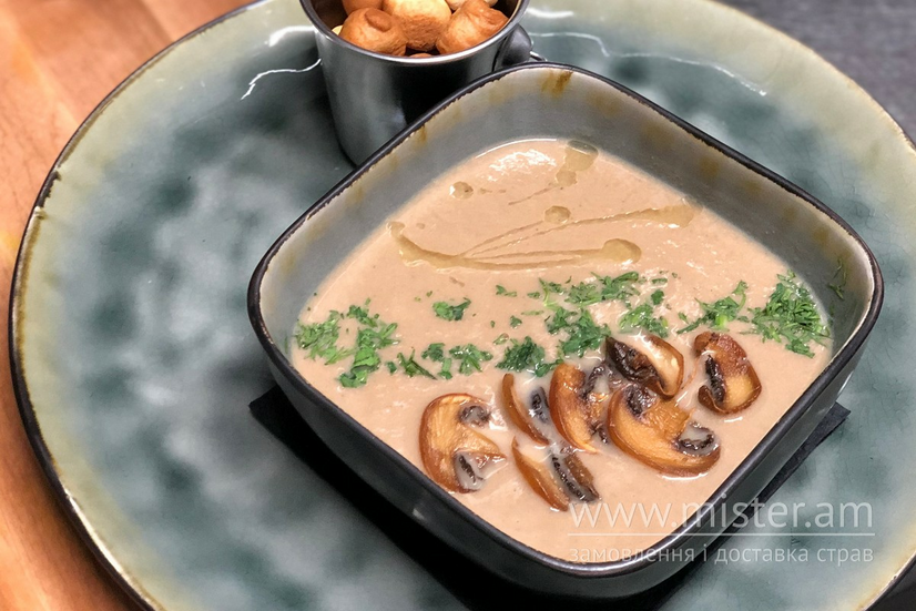 Гриби шампіньйони, вершки, курячий бульйон, олія оливкова, сіль/перець, грінки.