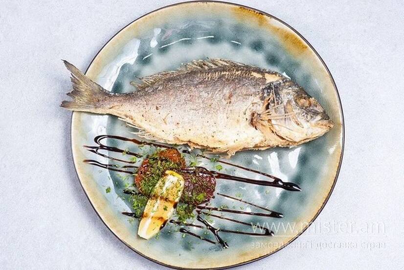 Дорадо запечена, в`ялений томат, лимон. Вагова страва, кінцева вартість замовлення може бути змінена після опрацювання закладом.