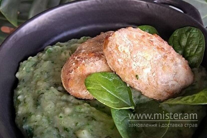 Котлети із сюдака, пюре картопляне з додаванням шпинату.