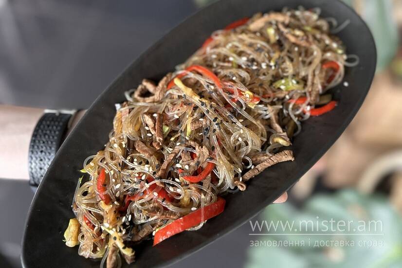 Локшина рисова, телятина, перець болгарський, кабачки, соус теріякі.