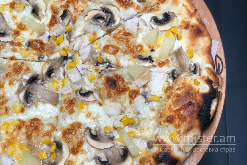 Тісто пшеничне, соус вершковий, суміш сирів моцарела та сулугуні , куряче філе, кукурудза, ананас, гриби шампіньйони.