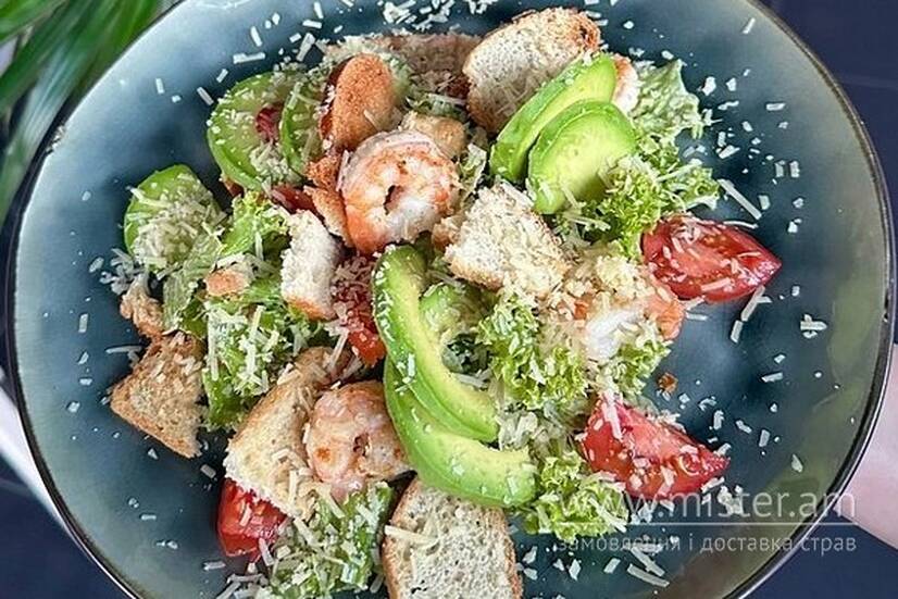 Креветка королівська, авокадо, сир пармезан, салат мікс, помідори, каперси, сухарі.