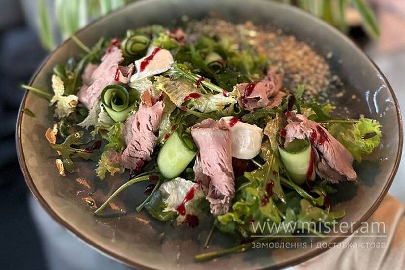 Під ягідним соусом. Мікс зелені, ростбіф, вершковий сир, огірок свіжий, в`ялені томати, соус вінігрет, соус ягідний, каперси, грецький горіх.