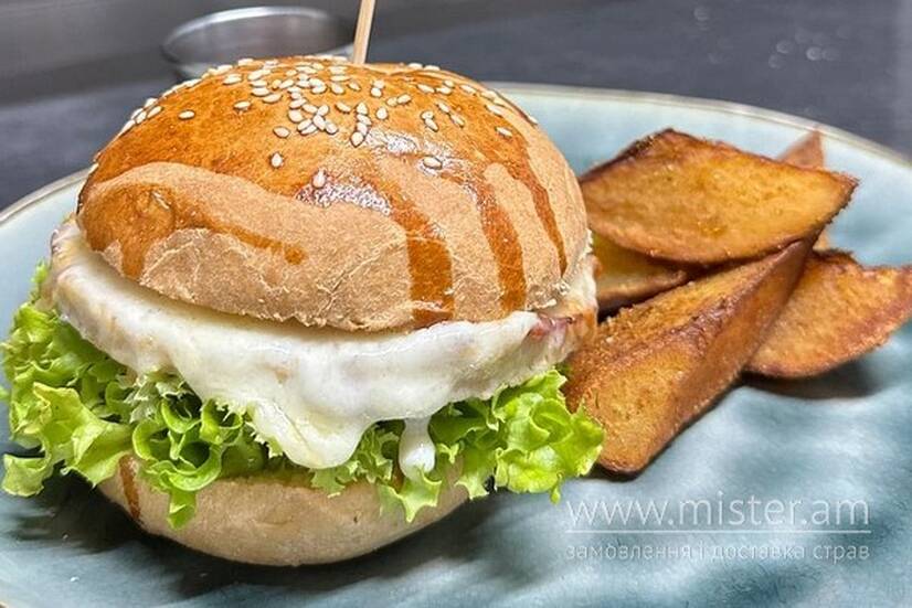 Булочка для бургера власного виробництва, котлета з філе індички, сир, лист салату, огірки мариновані, помідор свіжий, соус олів`є, соус барбекю, кетчуп, картопля по-селянськи.