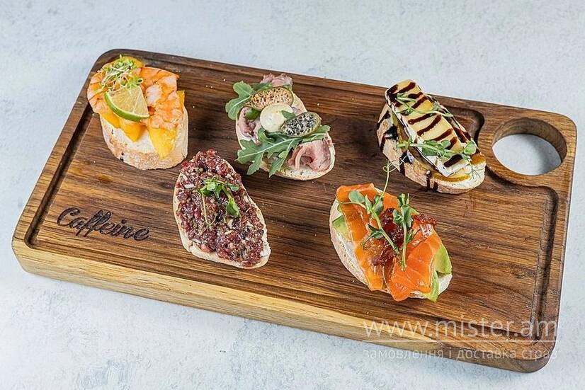 Ідеальне рішення для компанії: брускета з лососем та авокадо, брускета з грушею та сиром брі, брускета з креветкою та персиком, брускета вітелло тоннато, брускета з тартаром з телятини.
