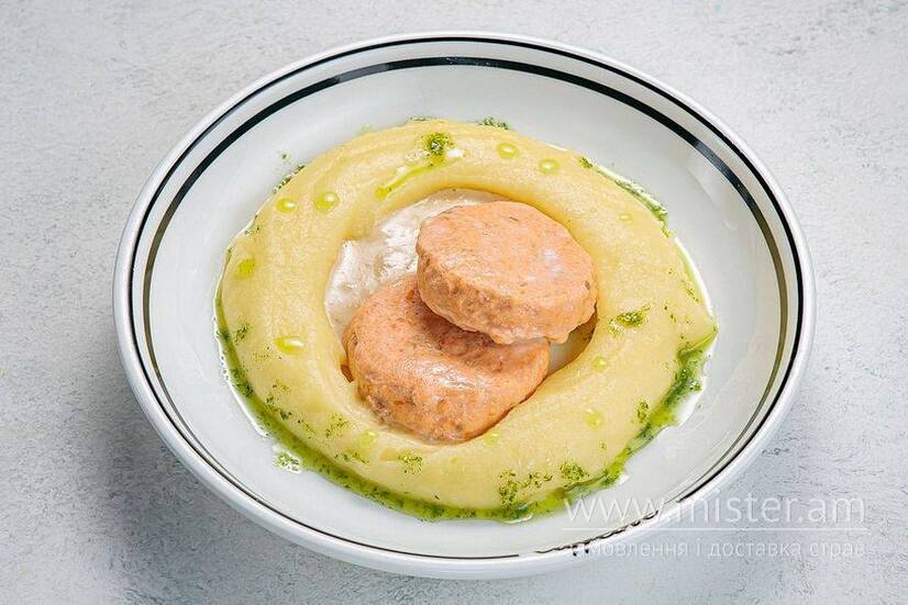 Дві ніжні котлети з лосося на подушці з картопляного пюре з пармезаном. Поливаємо зеленим маслом.
