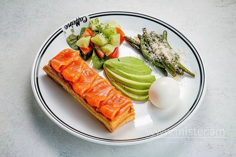 Цей сніданок наповнений свіжістю та зеленню. М`яка бельгійська вафля вкрита слайсами слабосоленого лосося, зелена спаржа - тертим пармезаном. Слайси авокадо додають смаку та яскравості, а варене яйце - ще й неабиякої поживності.