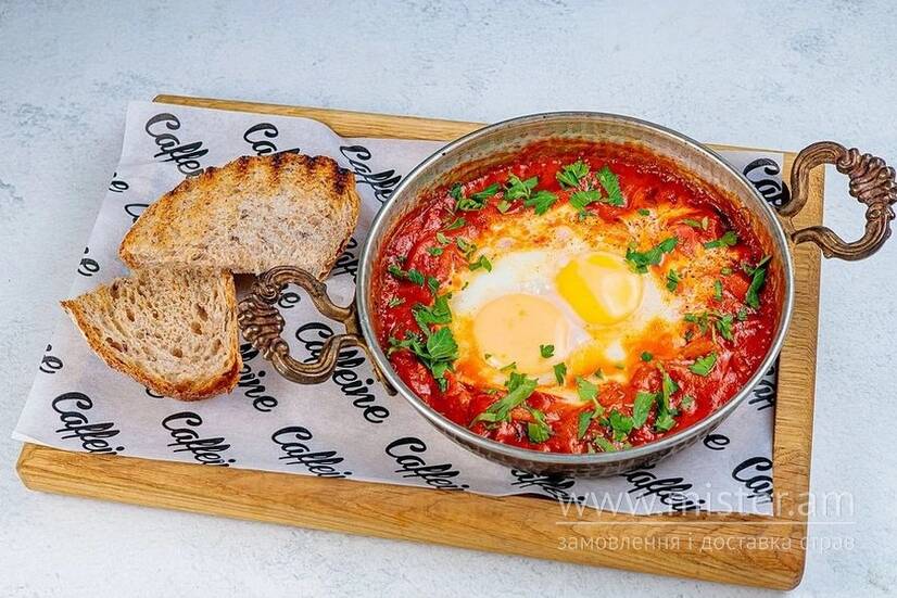Це традиційна східна страва з яєць, томатів пелаті, болгарського перцю, чилі та спецій. Пікантий, незвичний та неймовірно смачний сніданок. Подаємо з хрустким пшеничним хлібом власного випікання та прикрашаємо зеленню.