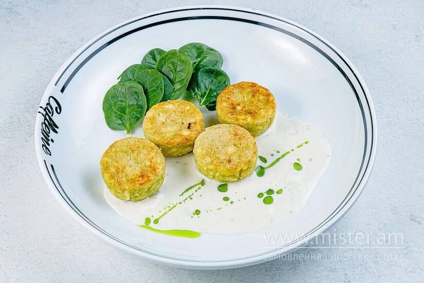 Наші фірмові сирники в незвичному виконанні. Шпинат та моцарелла роблять смак сирників дуже ніжним, а соус з блакитним сиром додає особливості.