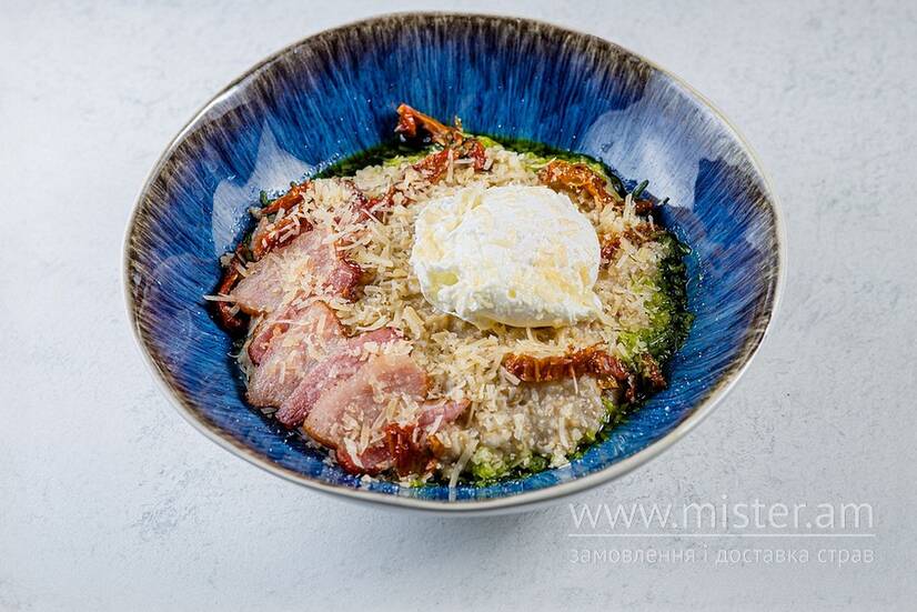 Вівсяна каша з беконом та яйцем пашот