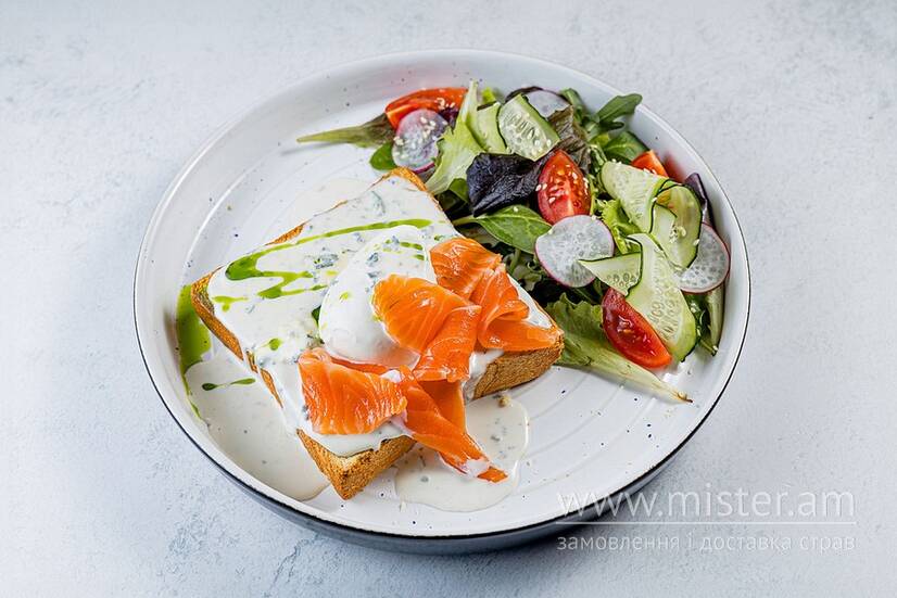Булочка бріош, шпинат, лосось власного посолу, соус з блакитного сиру, яйце пашот.