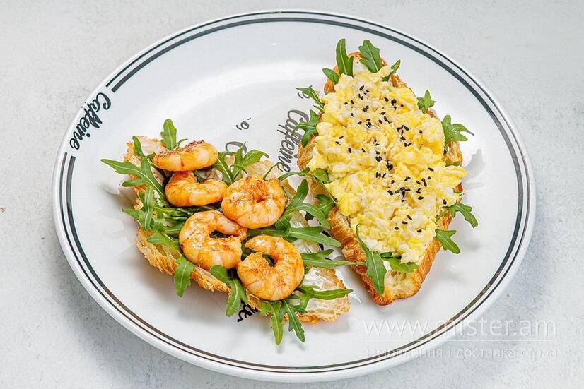Поживний та незвичайний сніданок - це круасан з креветками гриль та скремблом. Легкий крем сир в основі додає ніжності хрусткому круасану, а рукола - смак свіжості.