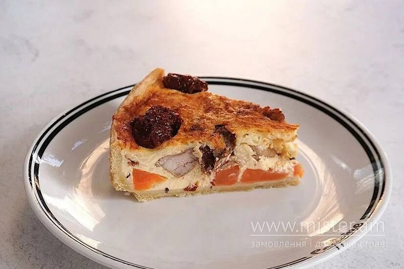 Золотиста основа, шматочки соковитого курячого стегна, м’який батат і в’ялені томати - ніжно і соковито.