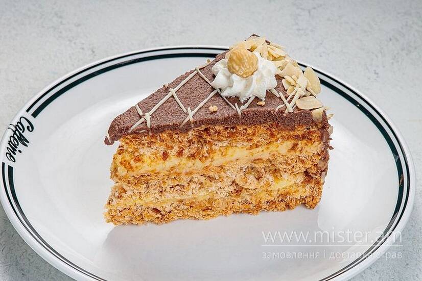 Побувати у столиці, сидячи у Caffeine? Можливо все разом з цим тортом! Білкові повітряні коржі з горіхами, просочені кремом Шарлотт, вкриті какао та білим шоколадом.