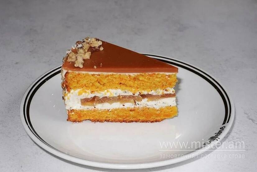 Морквяний біскіт з грушевою прослойкою, крем-чіз на білому шоколаді з сиром дорблю, вкритий карамеллю та обсмаженими горіхами з сіллю.
