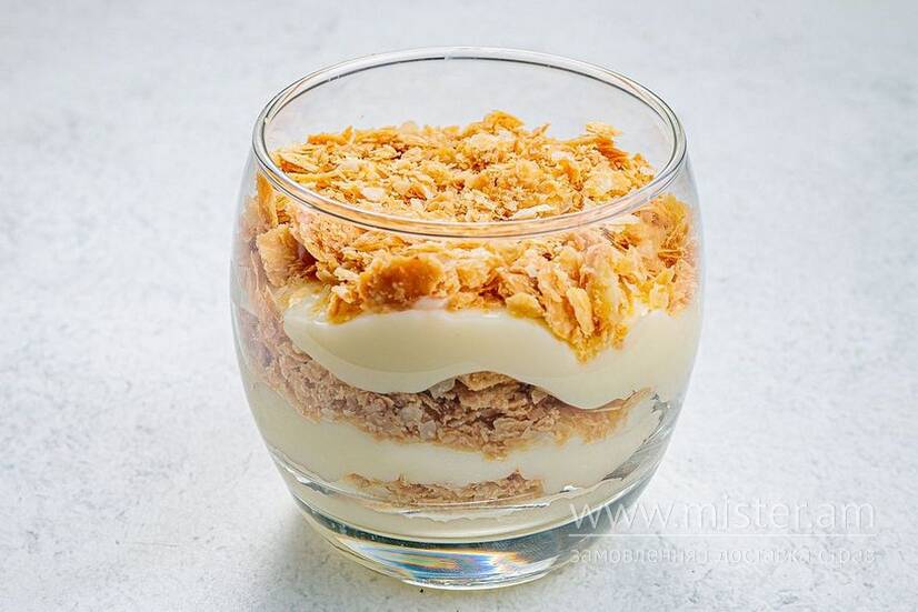 Нестандартна подача класичного та усіма знайомого Наполеону. Крихта листкових коржів, пропитана заварним кремом та білим шоколадом.