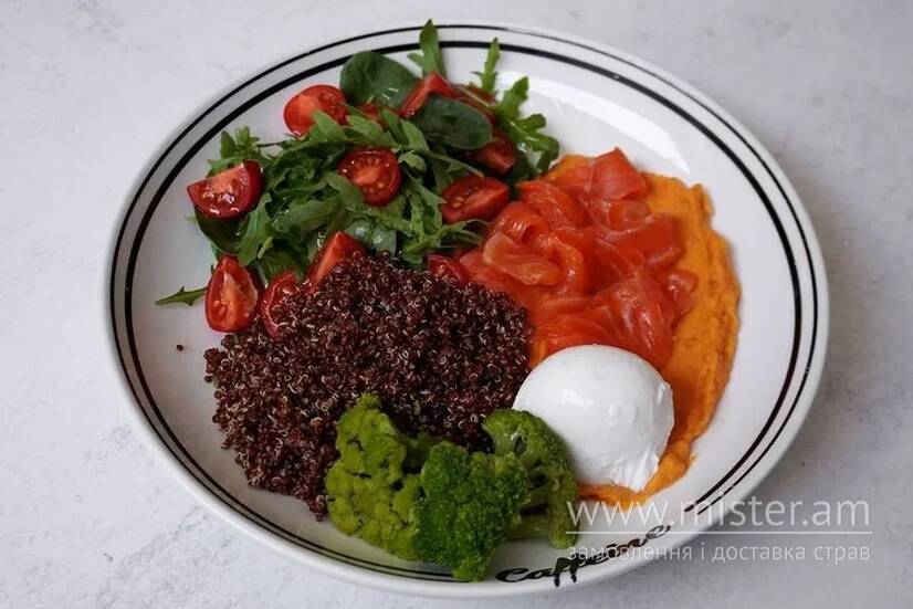 Ніжне пюре з батату та кіноа поєднується з яйцем пашот і слабосоленим лососем, доповнене шпинатом, томатами, броколі та ароматною оливковою олією. Природна солодкуватість батату вдало контрастує з ніжним лососем і вершковим жовтком, створюючи гармонійний баланс смаку й текстур для здорового початку дня.