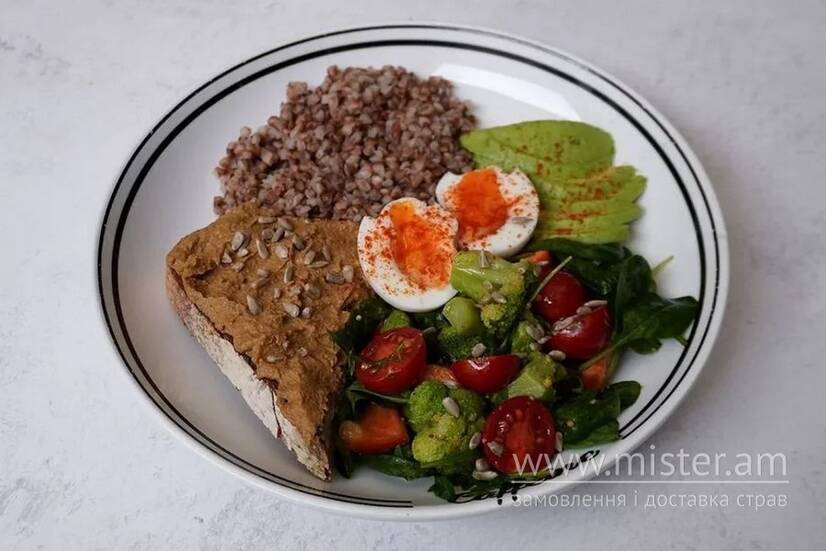 Тост із пшеничного хліба на заквасці з паштетом із курячої печінки та яйцем із рідким жовтком. Подається з теплою гречкою, салатом із болгарського перцю, броколі, томатів і авокадо та гірчичною заправкою.
