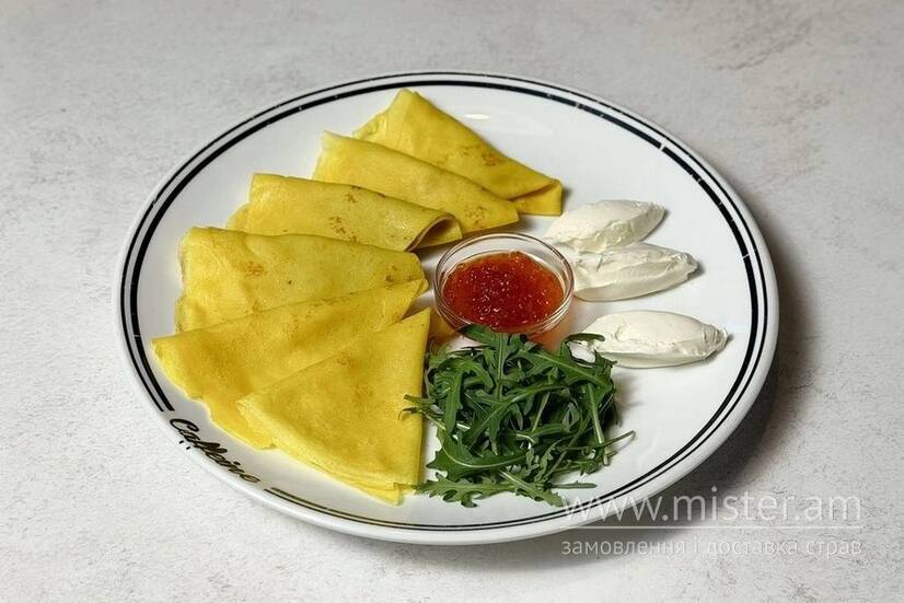 Класичні тоненькі млинці з крем-сиром, руколою та червоною ікрою.