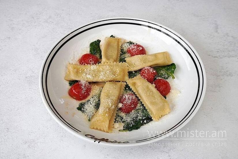 Ніжне тісто, соковите м’ясо кролика з вершками та коньяком, подаємо зі шпинатом та томатами чері, обсмаженими на вершковому маслі, та посипаємо пармезаном.