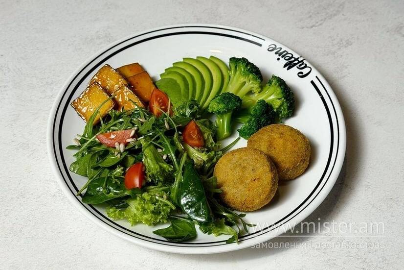 Сніданок зі смаженим тофу та гречаними котлетами — поживний і збалансований варіант на ранок. У складі гречані котлети, тофу в соусі світ-чилі, авокадо, броколі, мікс салату, томат і огірок, прикрашаємо насінням соняшника.