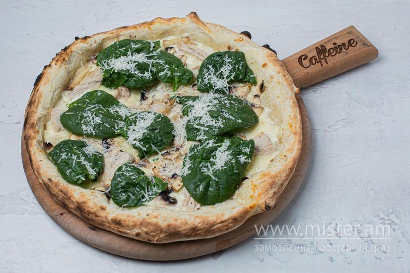 Моцарела, пекоріно, індичка, печериці, шпинат.