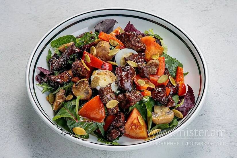 Соковитий мікс салат, грильований болгарський перець, томат та печериці, перепелине яйце і куряча печінка. Додаємо гарбузове насіння та заправляємо медово-гірчичним дрессінгом.