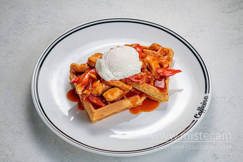 Вафлі з куркою, овочами, томатним соусом та яйцем пашот
