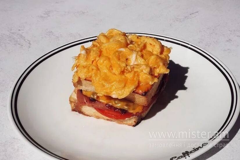 Французький гарячий бутерброд з хрустким хлібом бріош власного випікання, шинкою, карамелізованою цибулею, сиром, томатами та скремблом.