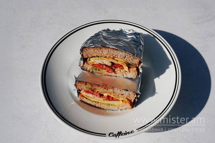 Пшеничний хліб власного випікання, запечена курка, сир, огірок, лист салату та печений перець.