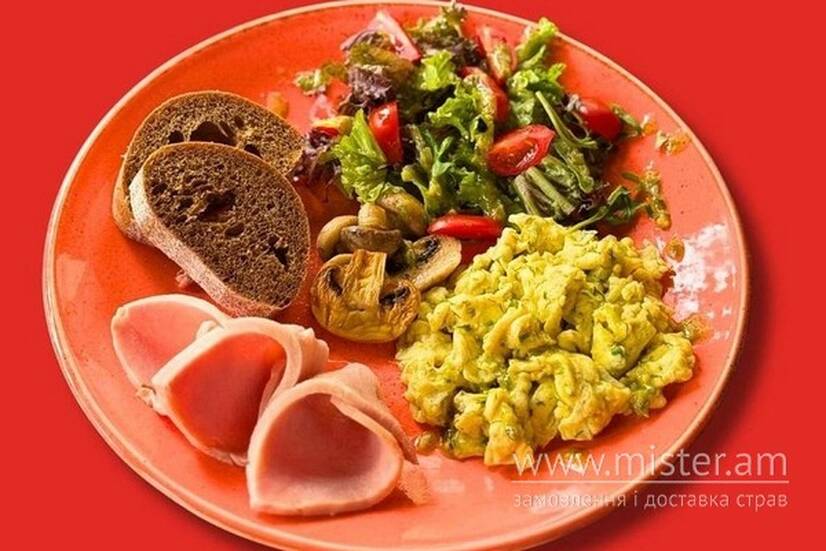 Печериці, томати чері з мікс-салатом і італійською чіабатою, скрембл з двох яєць.