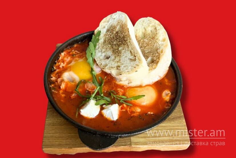Пікантна ізраїльська яєчня з томатним соусом, сиром Фета та руколою. Подаємо з обсмаженою італійською чіабатою.