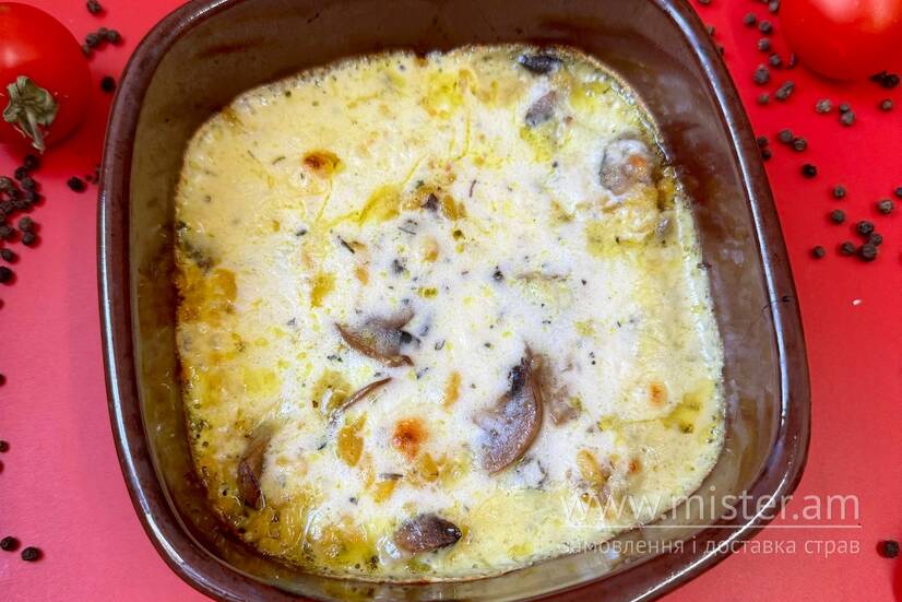Рис, мідії, креветки, гриби смажені, сир моцарела, вершковий соус.