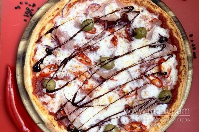 Томатний соус, прошуто Котто, салямі пікантна, перчик чілі, маринова цибуля, оливки.