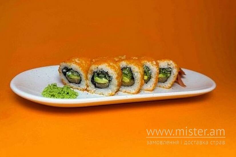 Рис нішикі, норі, лосось, авокадо, огірок, майонез, соус Кімчі, ікра тобіко.