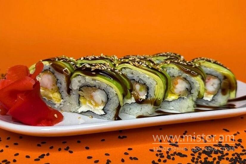 Рис нішикі, норі, креветки темпура, авокадо, крем-сир, апельсин, соус унагі, кунжут.
