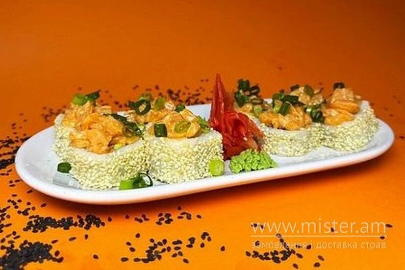 Рис нішикі, норі, креветку темпура, авокадо, лосось, ікра тобіко, майонез, соус Шрірача, зелена цибуля.