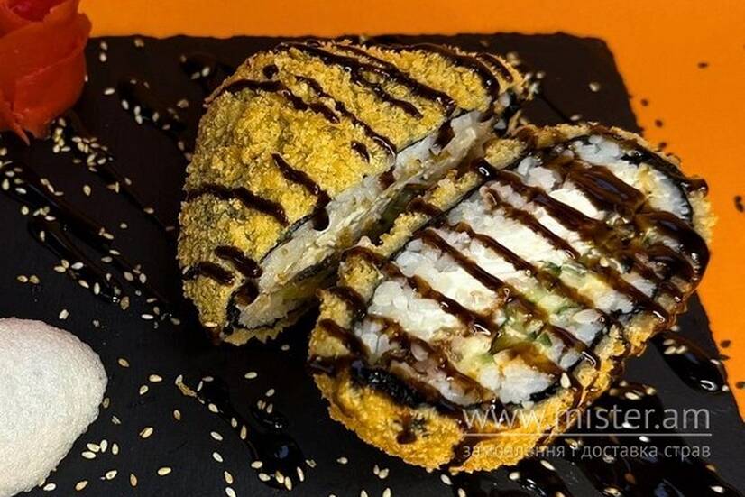 Рис нішикі, норі, вугорь з крем-сиром, огірком, соусом Спайсі та соусом Унагі.