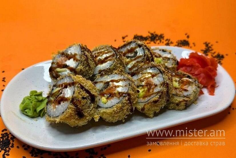 Рис нішикі, норі, вугор, авокадо, крем-сир.