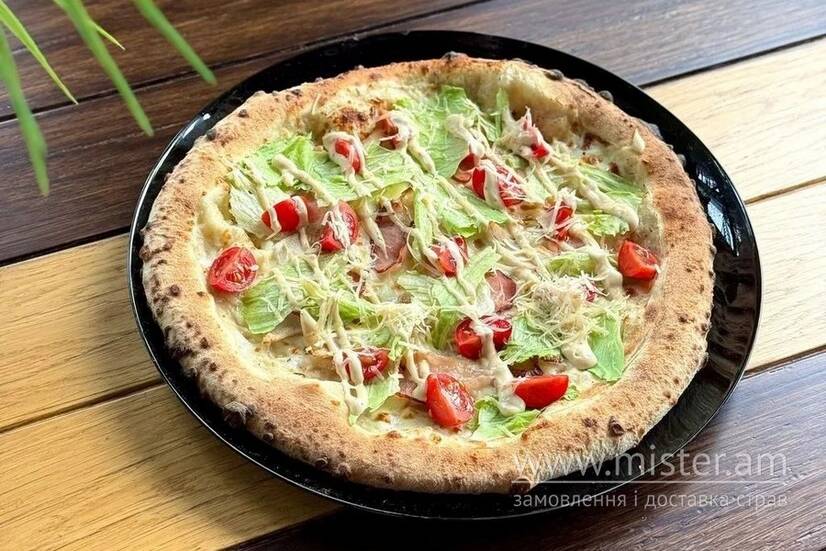 Білий соус, бекон, куряче філе, салат айсберг, чері, сири пармезан та моцарела, соус Цезаре.