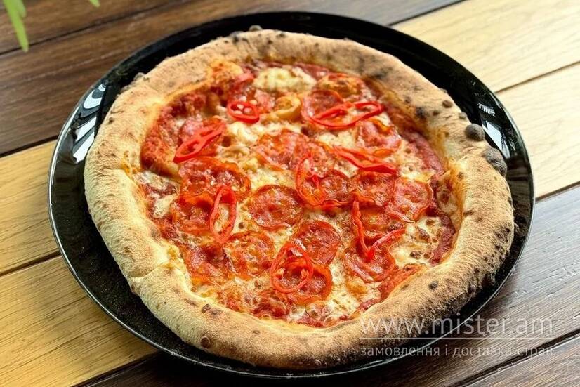 Домашній томатний соус, салямі, перець болгарський смажений і чілі, маслини та моцарела.